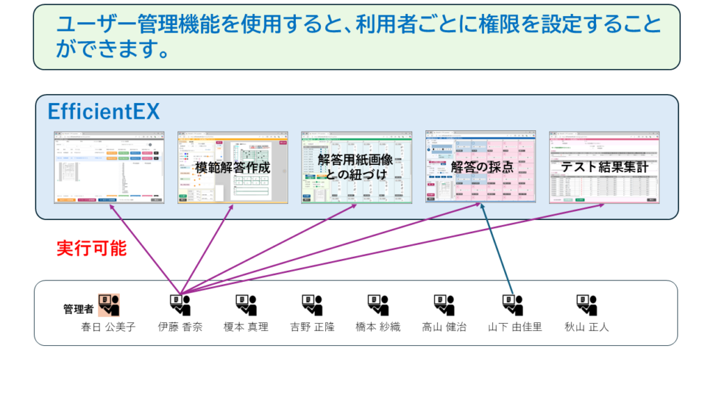 EfficientEXでは、模範解答の作成、生徒の解答用紙画像の読込み、解答の採点、テスト結果の集計と確認が行えます。ユーザー管理機能を使用すると、利用者ごとに、これらの実行が可能かどうかを制限することができます。