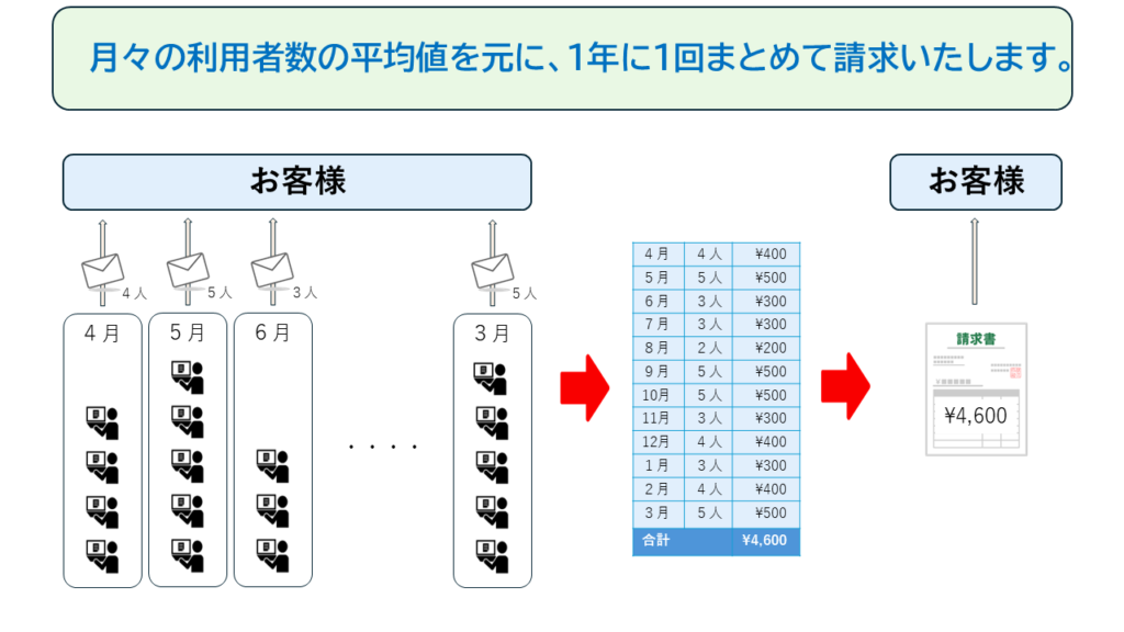 利用開始月から1年後に、月づきの利用者数の合計を計算し、その合計数に100円を乗じた金額を請求金額として、請求させていただきます。